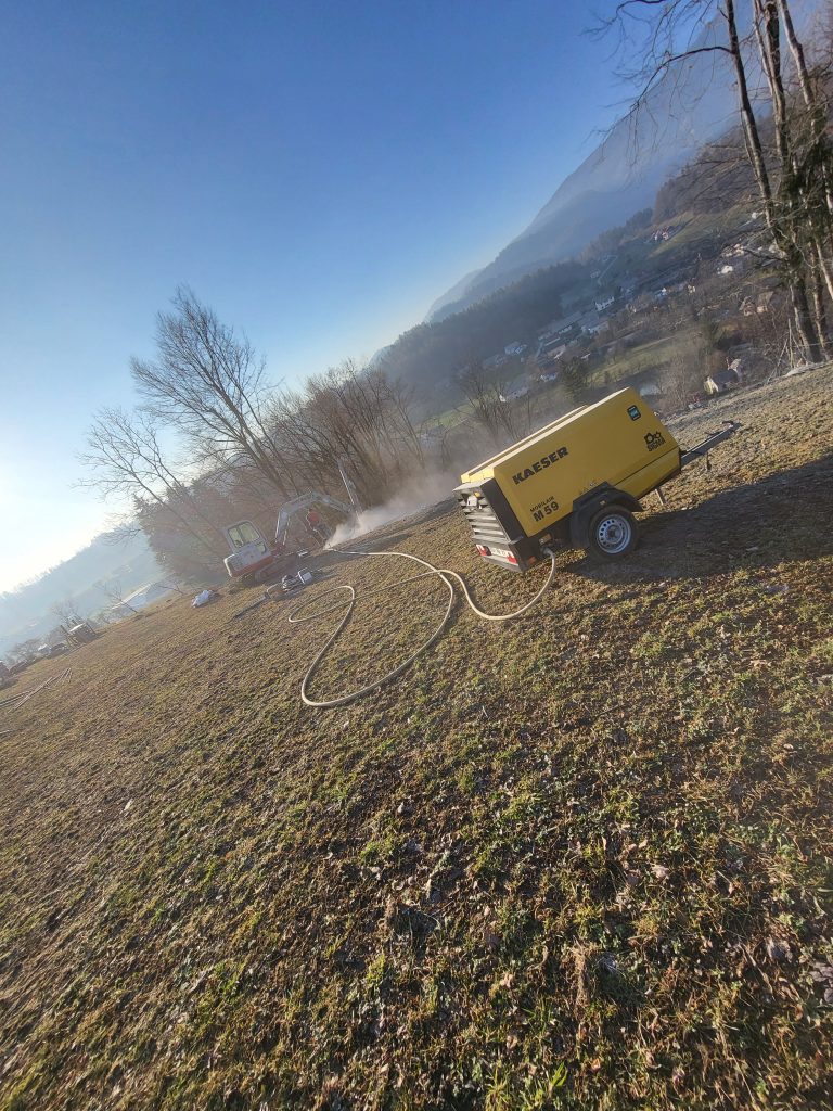 - Gradbeni kompresor KAESER M123, na voljo imamo 1 gradbeni kompresor nazivne moči 11,5m3/min, delovni tlak 8,6 bar, možnost povečanja na 10 bar ob moči 10,8m3/min. V gradbenem kompresorju je kot dodatna oprema razvlažilec zraka, tako da je gradbeni kompresor primer tudi za peskanje.